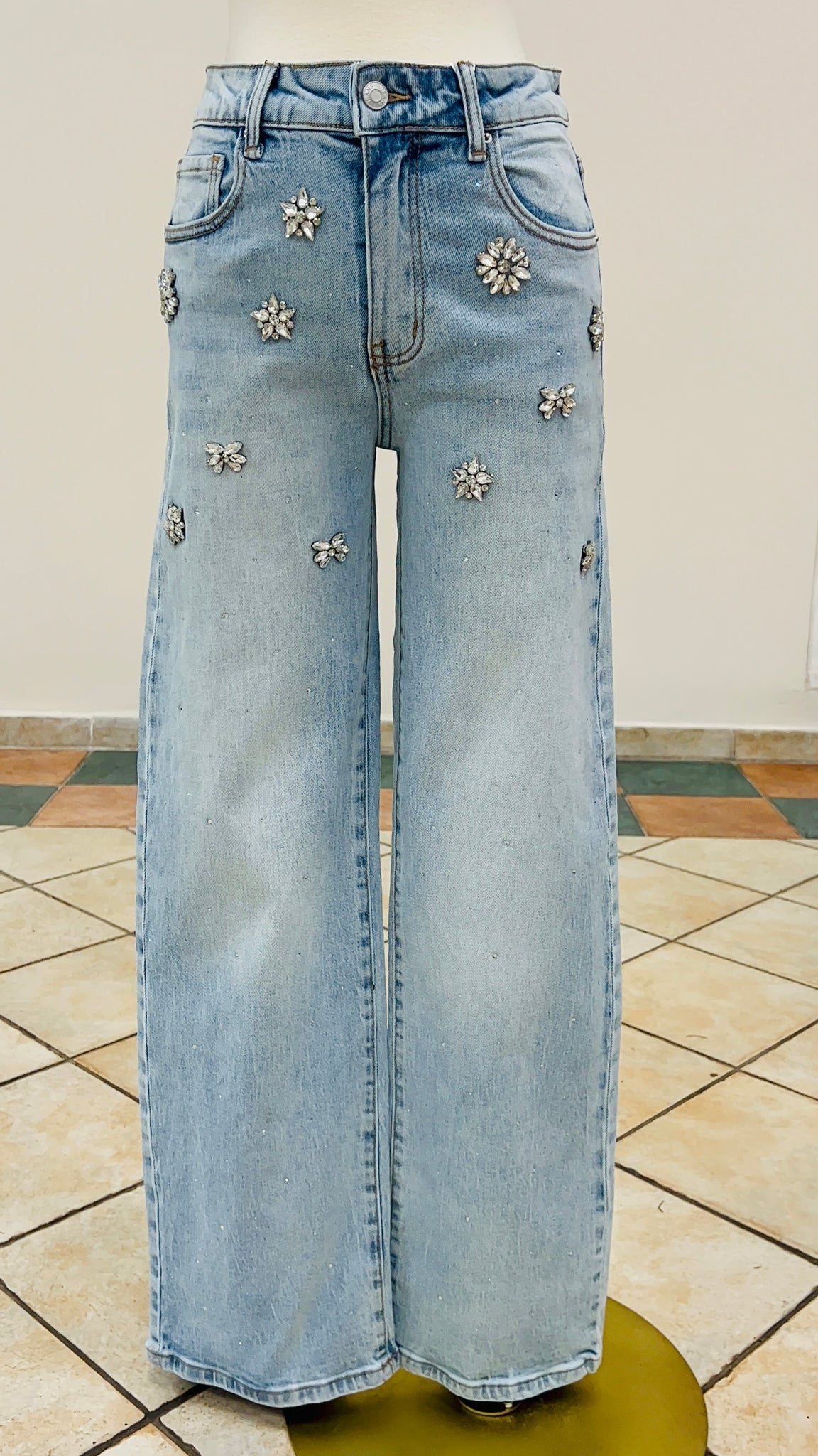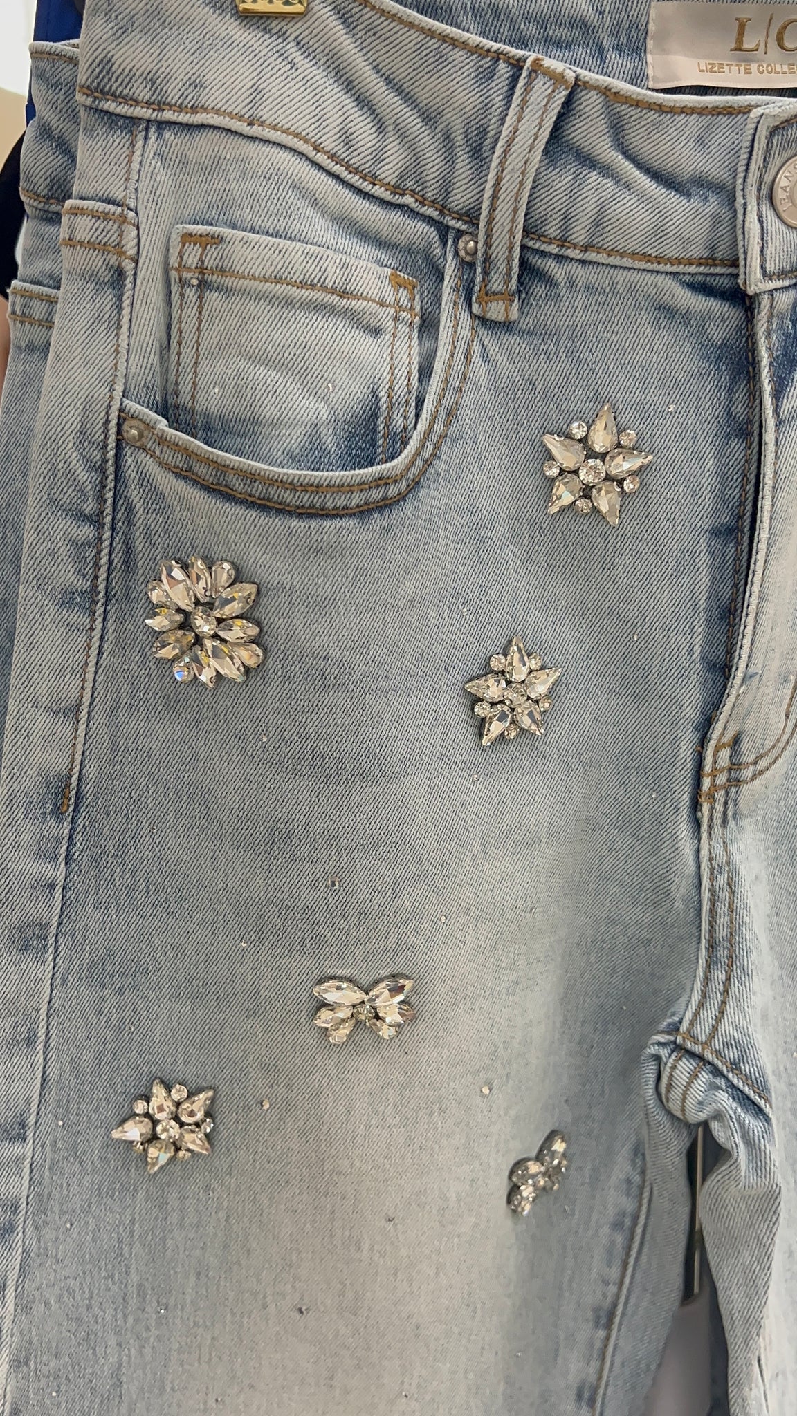 These light-wash wide-leg jeans feature exquisite hand-placed crystal beading in floral and butterfly shapes across the front. The design adds the perfect dose of shimmer without overwhelming the classic denim silhouette. Whether paired with a simple tee or a glam top, these jeans are ready to make a statement.