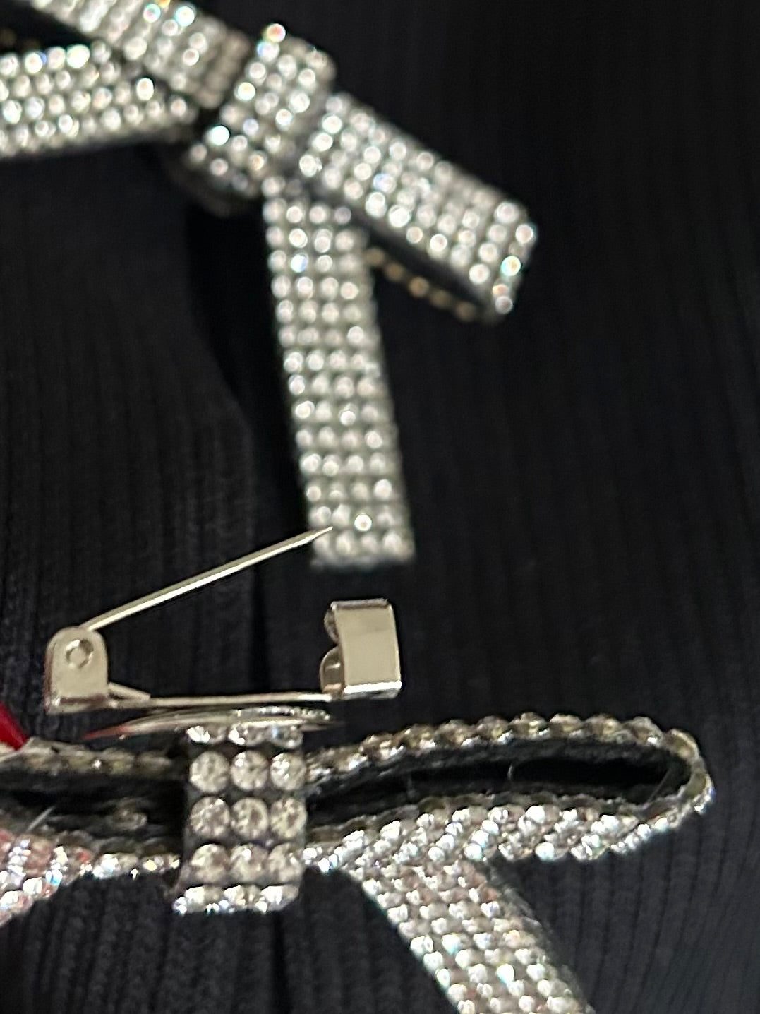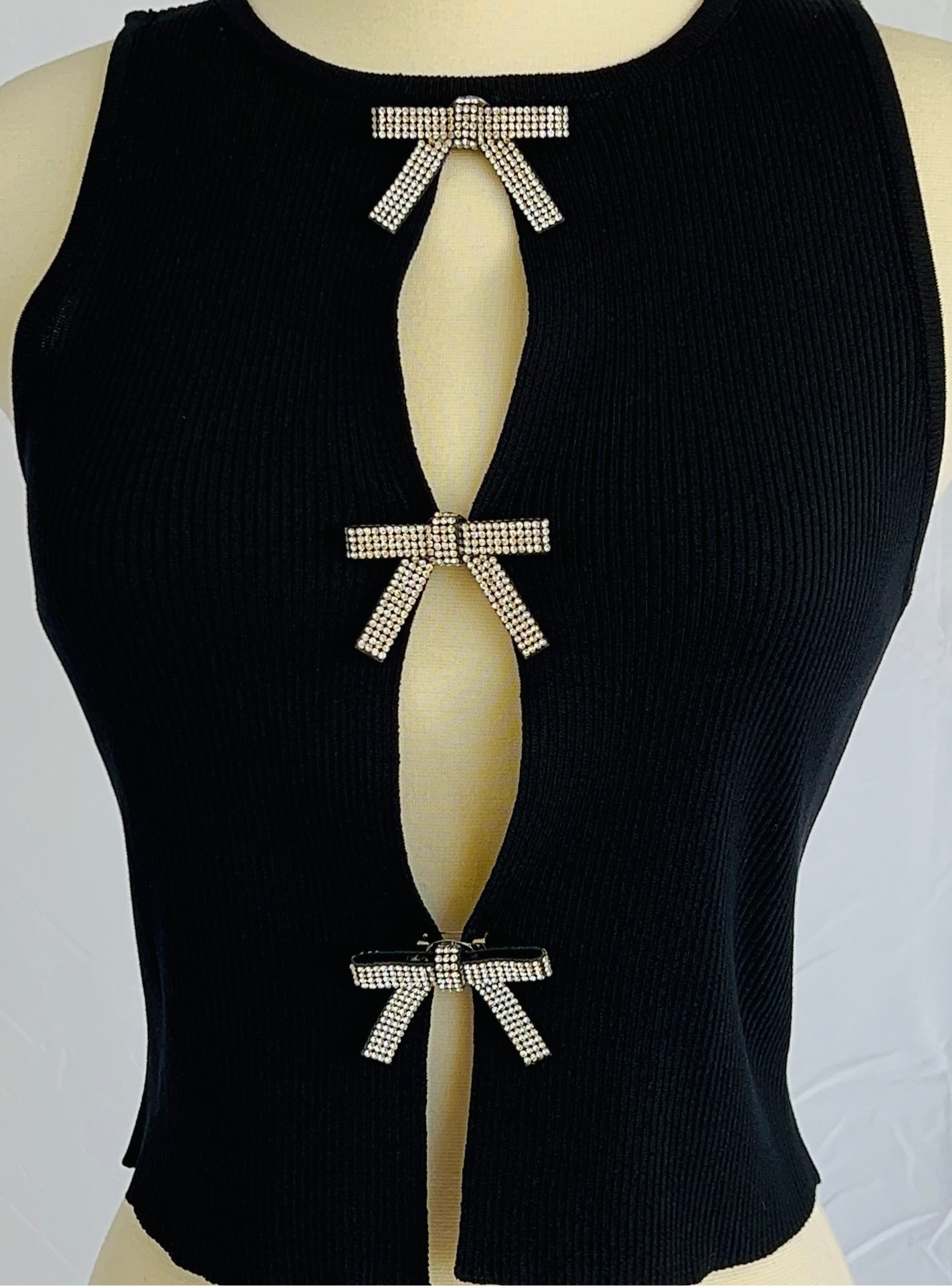 Make a bold statement with this stunning black sleeveless top featuring three removable rhinestones bow pins. Crafted from a soft, ribbed stretch fabric 68% Rayon 32% Nylon, this top combines edgy cutouts with ultra-feminine glam.